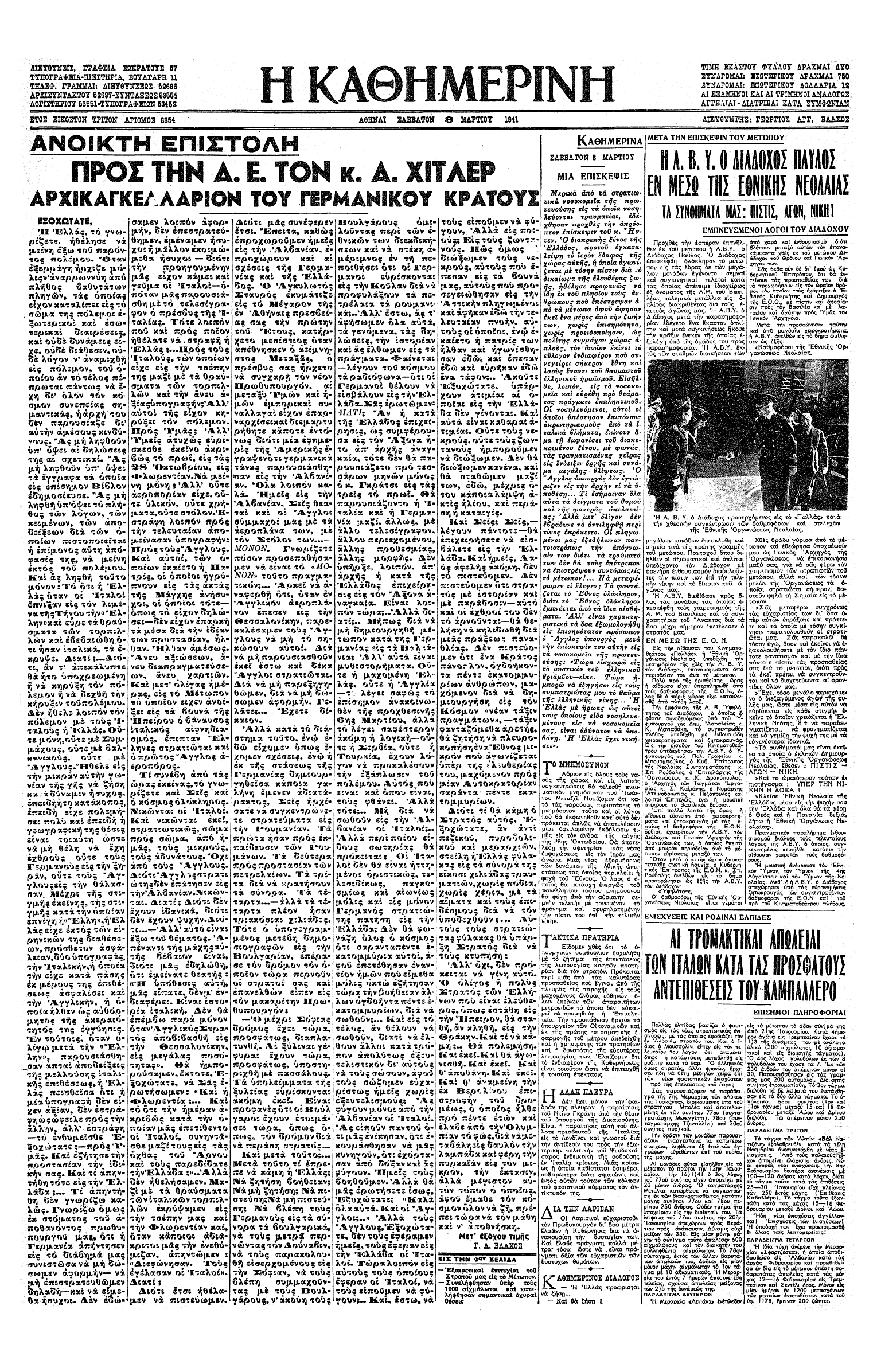 Εισαγωγικό σημείωμα: Ο ιδρυτής και διευθυντής της «Καθημερινής», Γεώργιος Α. Βλάχος, δημοσιεύει στις 8 Μαρτίου 1941 ανοιχτή επιστολή που απευθύνει στον Χίτλερ, με την οποία τον καλεί να μην κηρύξει τον πόλεμο στην Ελλάδα και του διαμηνύει ότι, αν τελικά κάτι τέτοιο συμβεί, οι Έλληνες θα πολεμήσουν.